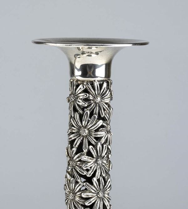 base circolare liscia e fusto interamente decorato con margherite. Argento 925/1000, punzonati "900" e "* 132 AR" e firmati G. Raspini.