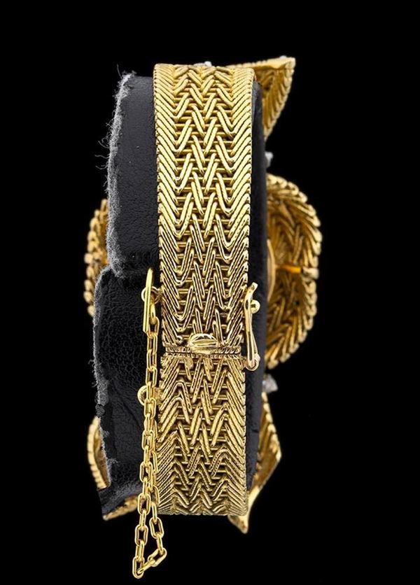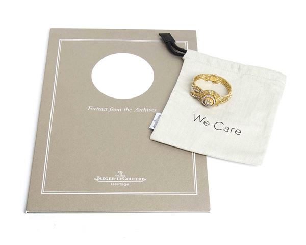 quadrante bianco con sfere e indici dorati firmato Jaeger-LeCoultre. Bracciale integrato in oro giallo 18 carati incastonato con 58 diamanti taglio brillante. Movimento meccanico a carica manuale Calibro Jaeger-LeCoultre 496, corona sotto il movimento. Numero del movimento 1172334, numero della cassa 717028.