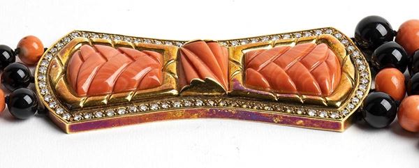 Lunga collana in oro giallo, onice, corallo Cerasuolo e diamanti ..., Gioielleria antica e d'epoca...