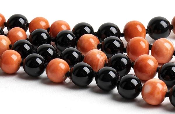 due fili di sfere di onice con sezione centrale a tre fili di sfere di corallo cersuolo (coralium elatius) alternate ad onice, con elemento a motovo di fiocco in oro giallo 18k incastonato con inserti di corallo inciso incorniciati da diamanti rotondi taglio brillante 2,15 ct circa, G-H, VVS-VS .