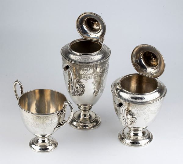 in stile neoclassico composto da una caffettiera , una teiera ed una zuccheriera poggianti su piede circolare con corpi incisi a taglio luce. Argento 925/1000, serie completa di marchi Londra 1869-1869, John, Edward, Walter & John Barnard (Barnard & Sons Ltd).