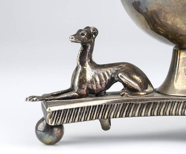 composta da una base dove poggiano le figure di tre cani con al centro un corpo sferico con al vertice lo stoppino. Metallo argentato (E.P.N.S. Electro plated nickel silver),Birmingham 1899, argentiere Elkinton & Co.