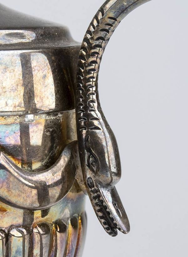di forma circolare, manico con testa animale e coperchio ad innesto. Punzonata con i marchi camerali in uso a Roma alla fiine del XVIII secolo.