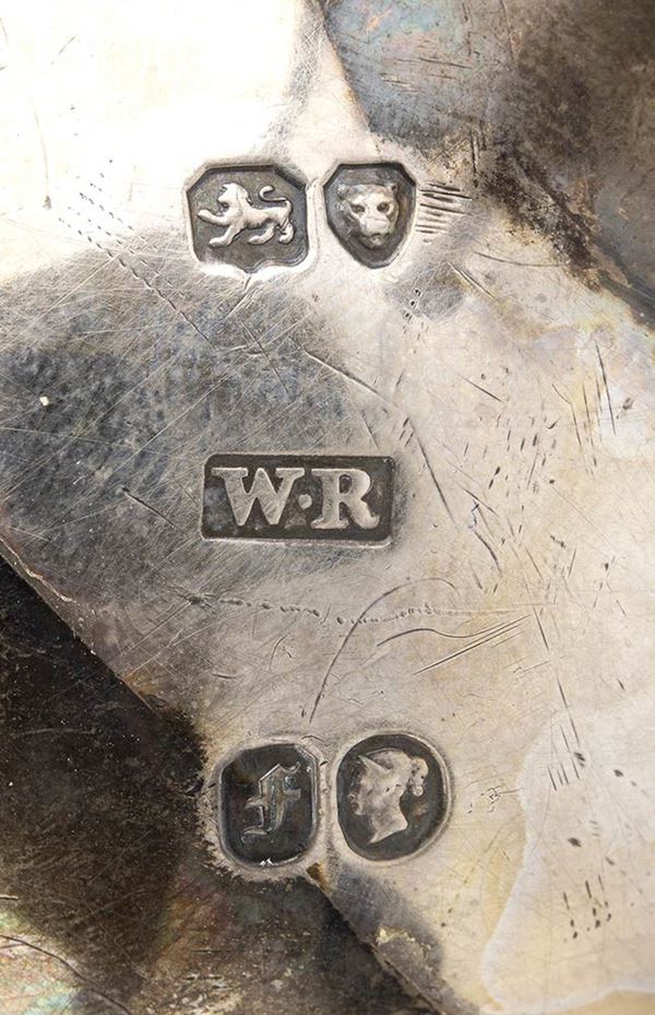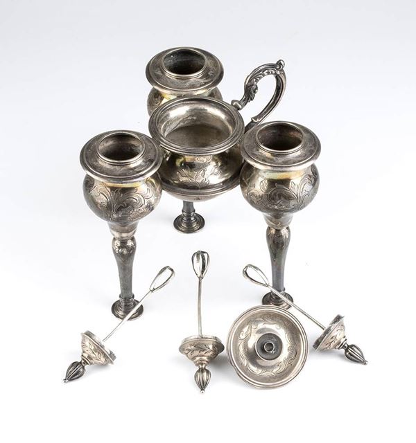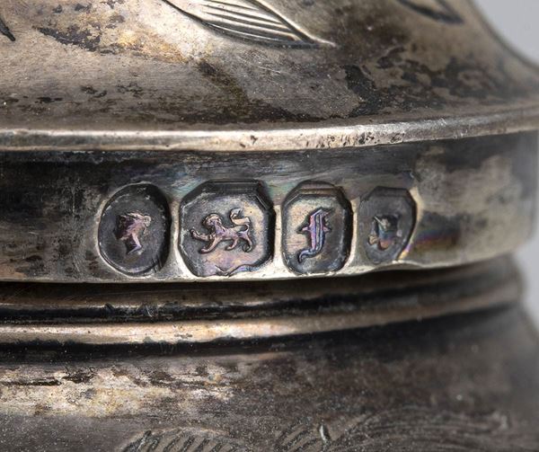 composto da tre contenitori laterali e uno centrale per lo stoppino, manico radiale. Argento 925/1000, serie completa di marchi Londra 1841-1842, maestro argentiere William Richards.