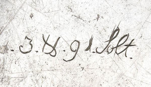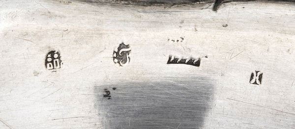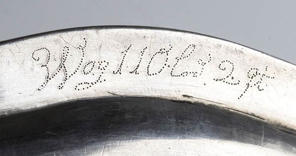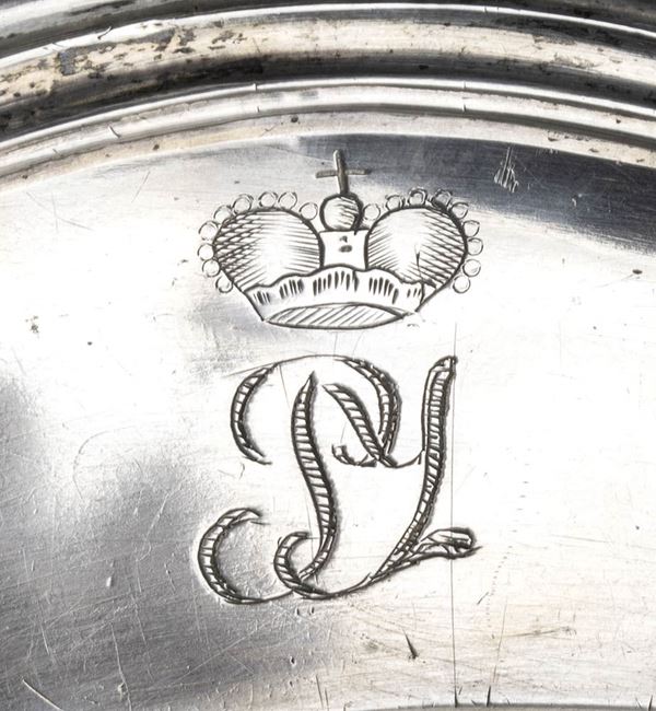 di forma rotonda con bordo modanato; sulla falda un monogramma con corona imperiale cimata da una croce. Punzonato al fronte con il marchi di controllo russi in uso a San Pietroburgo dal 1908 al 1927 rappresentati dalla "testa di donna con kokosnik con profilo rivolto a destra" e dal numero "76" per l'argento al titolo di 76 zolotnik (791,66/1000); al verso marchi non identificati con l'idicativo dell'anno 1777.