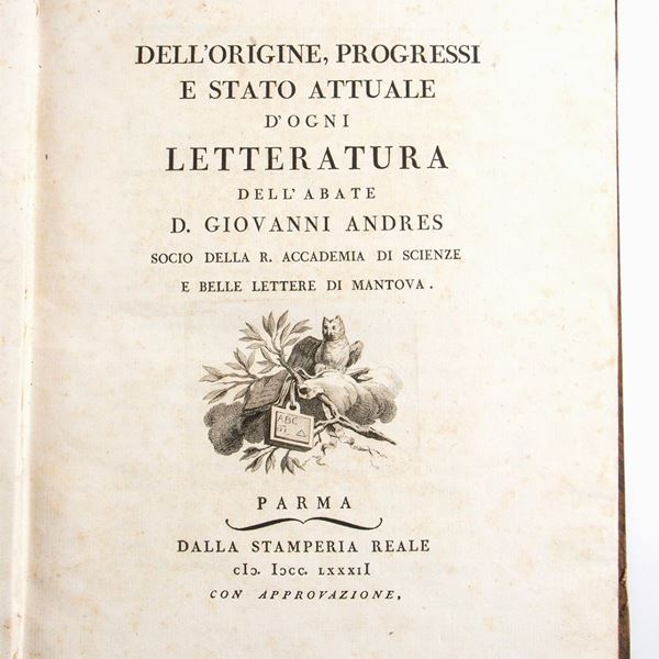 ANDRES JUAN DELL'ORIGINE, PROGRESSI E STATO ATTUALE D'OGNI LETTERATURA. Parma Stamperia Reale 1782