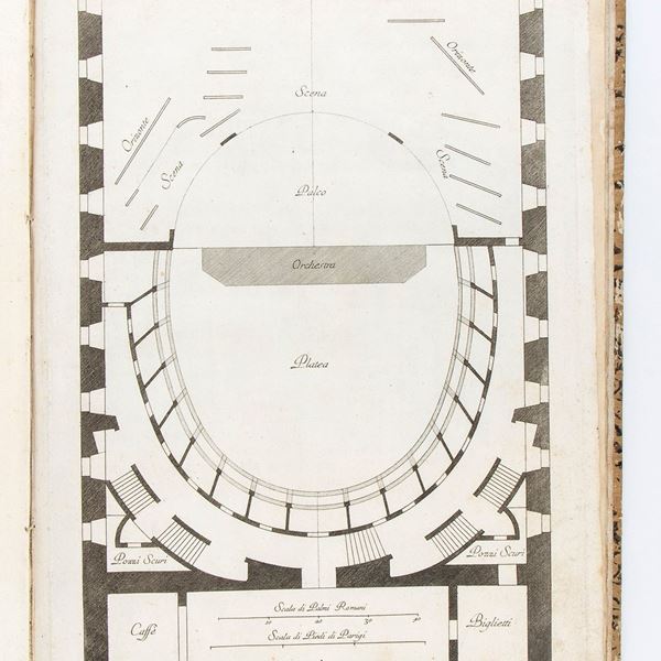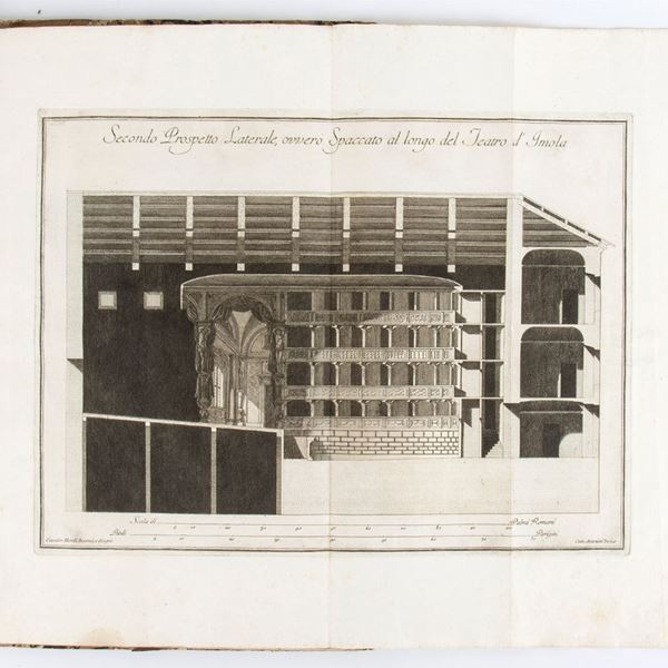 Le 11 tavole finali che raffigurano piante e alzati dei principali teatri di Bologna, Venezia, Torino, Napoli, teatro Greco, Imola, Vicenza, Milano, Roma, Genova, Fano, sono montate a formare un'unica lunga tavola ripiegata più volte; al frontespizio grande stemma calcografico; nel testo anche tre grandi rami che raffigurano il Foro di Nerva, l'ingresso del teatro di Pompeo, Rovine del teatro Marcello e una tavola a piena pagina sul "Modo di ridurre il teatro di Bologna alla forma d'Imola.