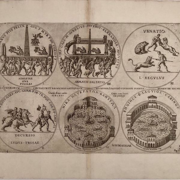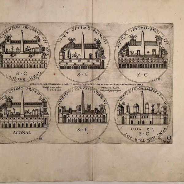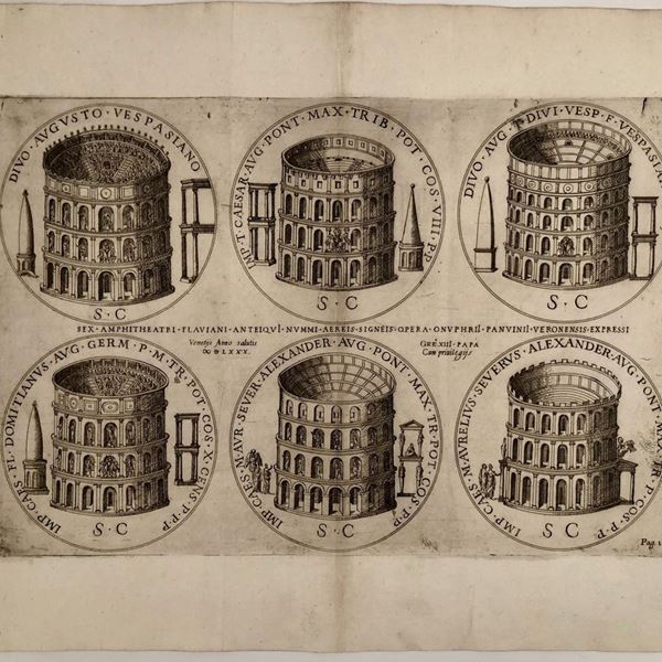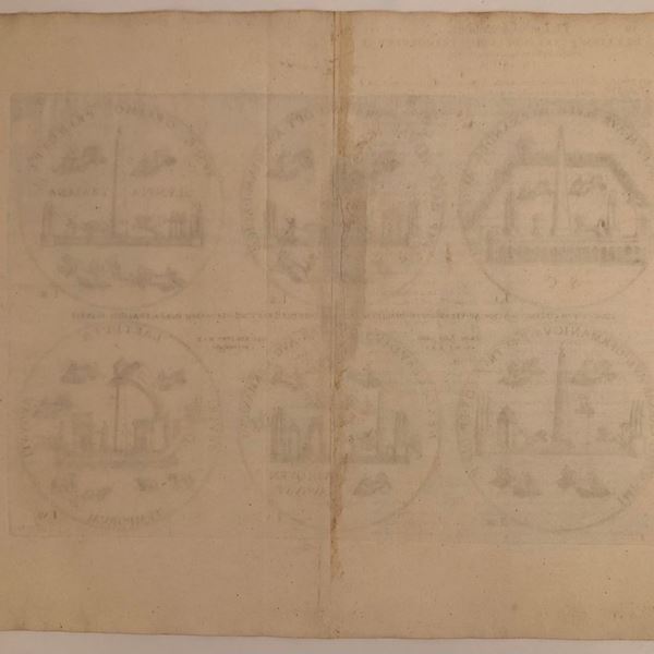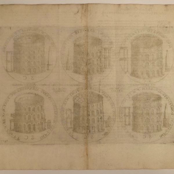 Lotto di 5 tavole raffiguranti i monumenti di Roma nel forma di monete...