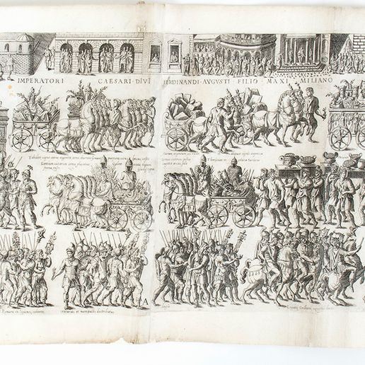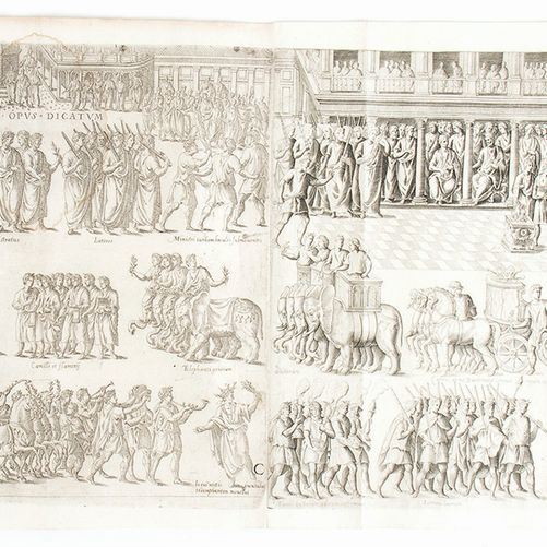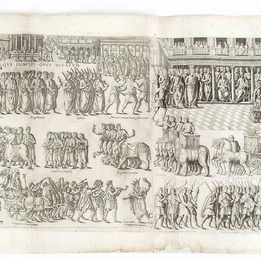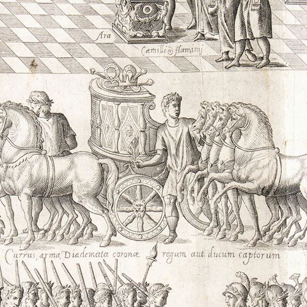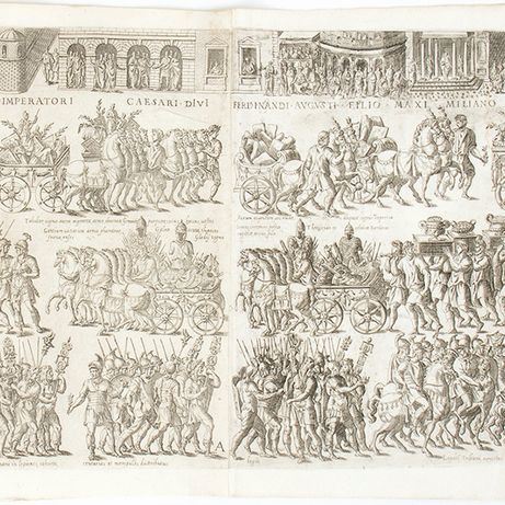 Lotto di due tavole raffiguranti trionfo romano con soldati. Parte di Speculum Romanae Magnificentiae.