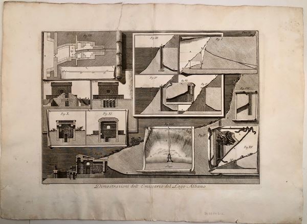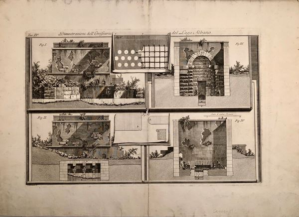 Tavola I, II e IV della serie Descrizione e disegno dell'Emissario del Lago Albano, 1762. Focillon 783