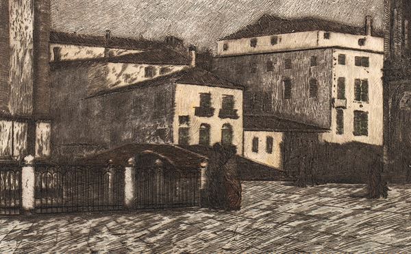 Il profilo della statua equestre del condottiero si staglia scurissimo dalla sua base, su uno sfondo di nuvole nel cielo, con una suggestiva armonia dei chiaroscuri, resi magistralmente anche dalle diverse zone chiare della lastra, e dall'uso dei diversi colori nelle altre parti della veduta.                                                                                                                                                  Angelo Rossini è stato un pittore e incisore italiano.  Dopo l’iscrizione alla facoltà di Architettura all’Università di Roma, abbandonò gli studi per dedicarsi alla pittura e all'incisione. Nel 1903 tornato a Roma dopo un breve soggiorno in Germania, si avvicina al Gruppo dei Pittori dei XXV della campagna romana, con i quali condivideva l’amore per la natura  ed i parchi delle ville storiche suburbani. Fu attratto in modo particolare dai riflessi della luce sull'acqua, e viaggiò a Chioggia e a Venezia, per indagare i solitari soggetti lagunari, spesso anche ritratti in notturno con ricchezza di forti accenti chiaroscurali. Rossini  fece parte del sodalizio GRIA (Gruppo Romano Incisori Artisti), formato nel 1921 da un'idea di Federico Hermanin, Soprintendente alle Gallerie e Musei di Roma, che raccolse intorno a sé, a Palazzo Venezia, gli incisori più rappresentativi che in quegli anni operavano nella Capitale.
