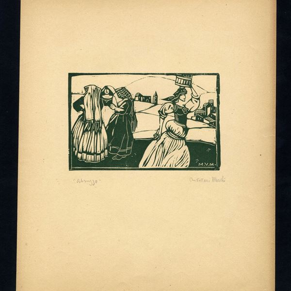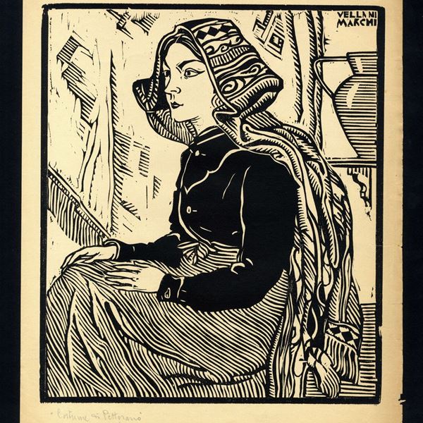 Soggetti con contadini e costumi popolari abbruzzesi; il tipico costume del paese di Pettorano sul Gizio, con una delle caratteristiche più riconoscibili dei costumi di questa regione: un particolare copricapo formato da una grande e lunga stoffa di lino che veniva ripiegata in modo ben preciso sulla testa e sulle spalle, e terminava con un bordo frangiato. Esemplari stampati con varie colorazioni, con bei toni chiaroscurali che disegnano gli abiti, attraverso il tratteggio tipico di questo autore, con l'uso delle campiture in linee orizzontali e verticali.