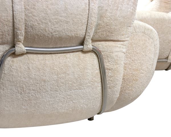 Set di divano e poltrone in metallo e tessuto, progettato e realizzato negli anni '70, nello stile di Adriano Piazzesi. Ottime condizioni.