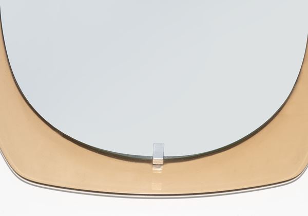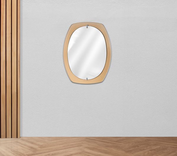 Specchio "Veca" con cornice in vetro caramellato e teste di vite in ottone nichelato.