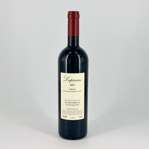 Castello del Terriccio, Lupicaia  Toscana, Lupicaia IGT - 1 bottiglia (bt) annata 2015.  Livello: entro il collo (WN), livello di colmatura standard.  Condition report: etichetta e capsula in perfette condizioni.