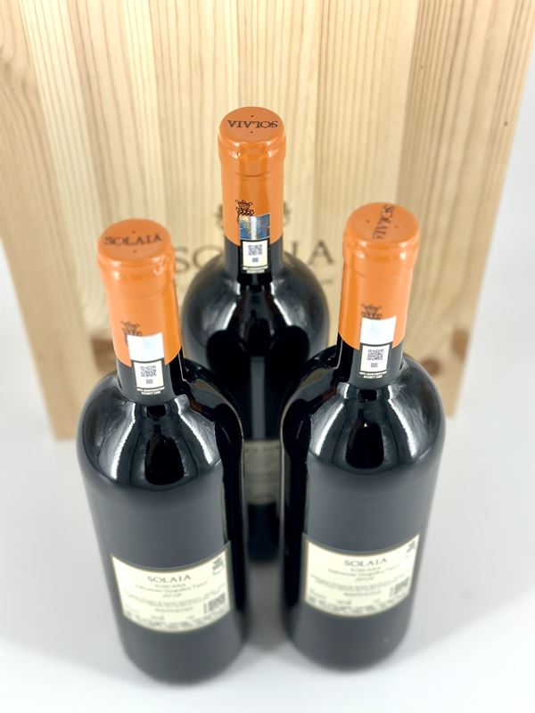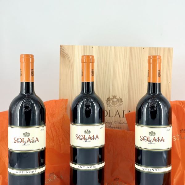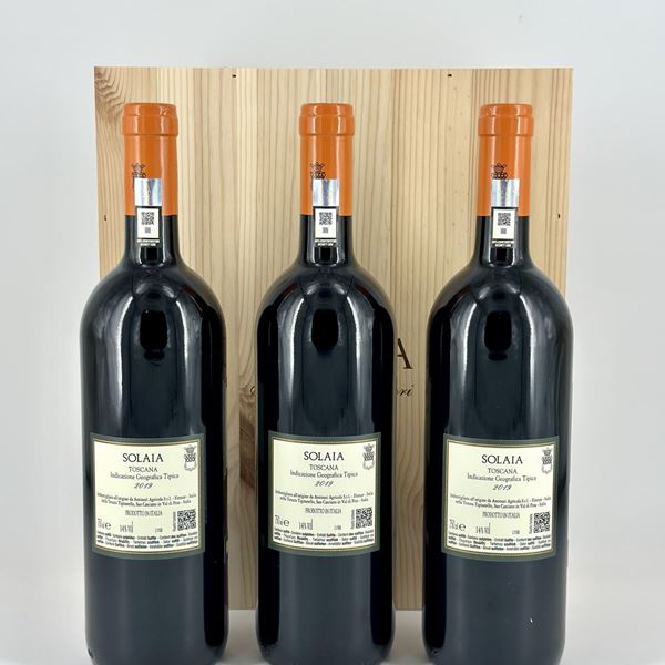Marchesi Antinori, Solaia Toscana, Solaia IGT - 3 bottiglie (bt) annata 2019. Livello: entro il collo (WN), livello di colmatura standard. Confezione : Scatola di legno originale (OWC). Condition report: etichetta e capsula in perfette condizioni.
