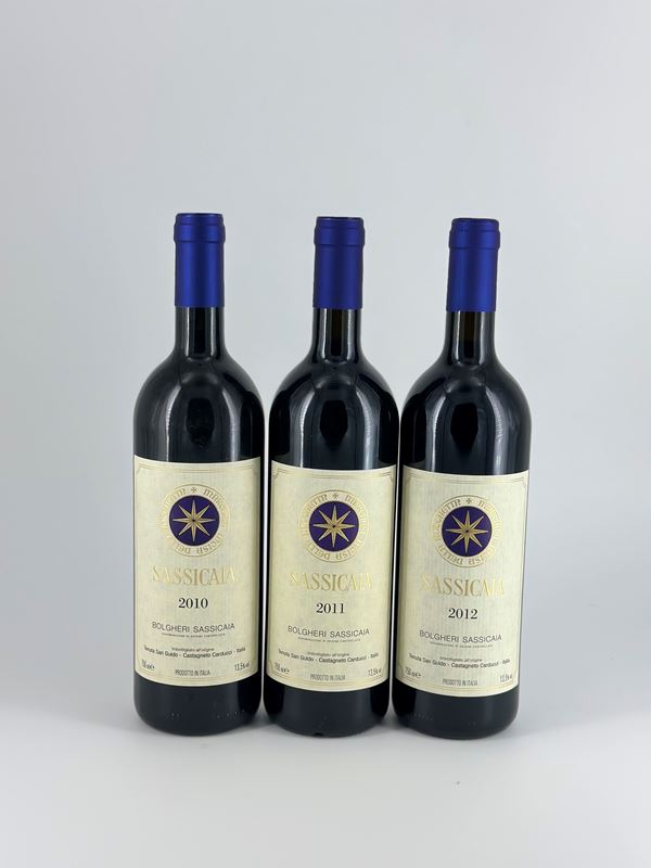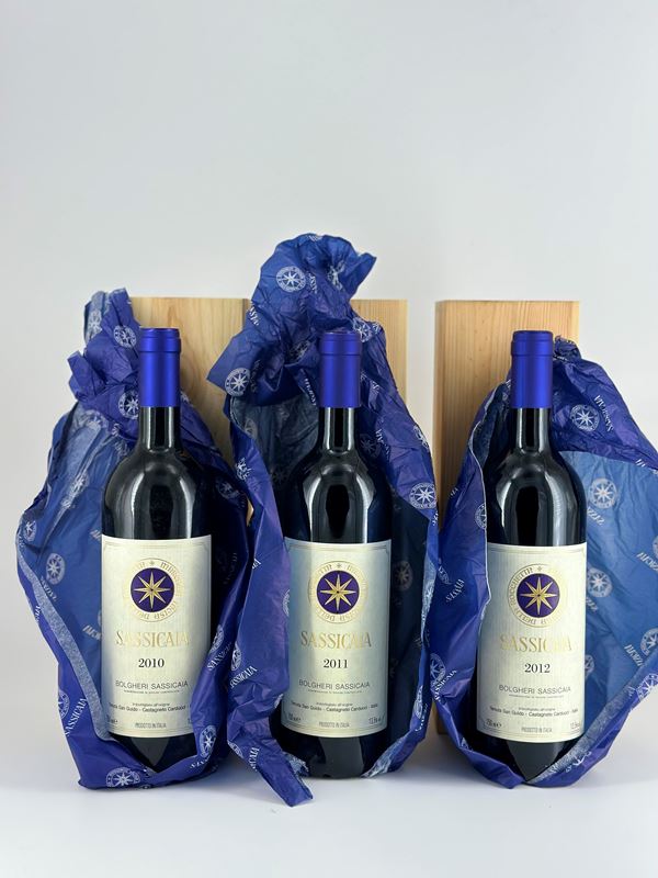Tenuta San Guido Bolgheri, Sassicaia a) Toscana, Sassicaia DOC - 1 bottiglia (bt), annata 2010. Livello: entro il collo (WN), livello di colmatura standard. Confezione: scatola di legno originale (OWC). Condition report: etichetta e capsula in perfette condizioni. b) Toscana, Sassicaia DOC - 1 bottiglia (bt), annata 2011. Livello: entro il collo (WN), livello di colmatura standard. Confezione: scatola di legno originale (OWC). Condition report: etichetta e capsula in perfette condizioni. c) Toscana, Sassicaia DOC - 1 bottiglia (bt), annata 2012. Livello: entro il collo (WN), livello di colmatura standard. Confezione: scatola di legno originale (OWC). Condition report: etichetta e capsula in perfette condizioni.