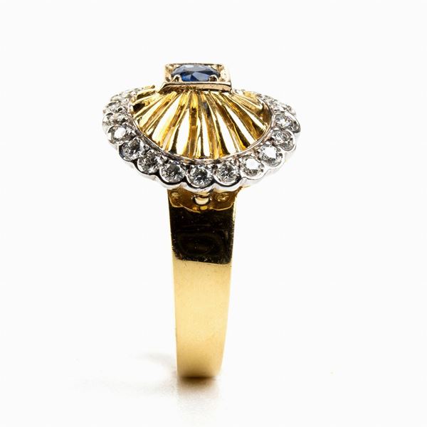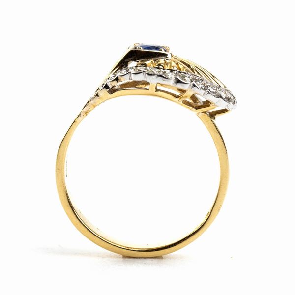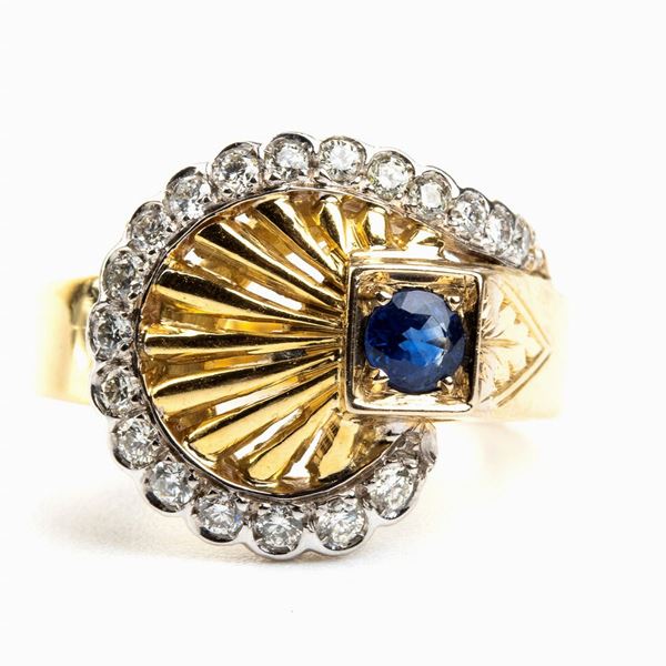oro giallo ed oro bianco 18k, incastonato con zaffiro affiancato da un nastro in diamanti. N. 20 diamanti di forma rotonda, taglio brillante 0,60 ct circa, G-H, VVS-VS. N. 01 zaffiro di forma rotonda taglio composito 0.20 ct circa. Punzonato "750".
