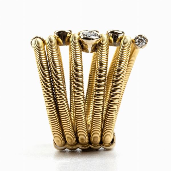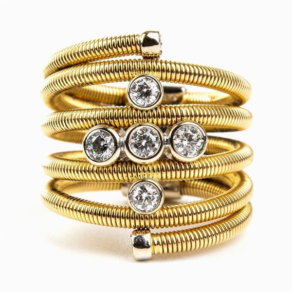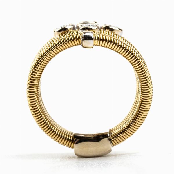 oro giallo ed oro bianco 18k, incastonato con 5 diamanti di forma rotonda, taglio brillante 0,50 ct circa, F-G, IF-VVS. Punzonato "750".
