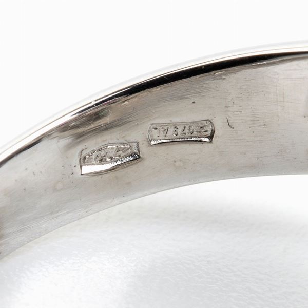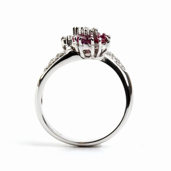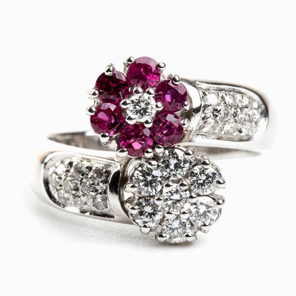 oro bianco 18k, motivo contrarie' con motivi a fiore in rubini e diamanti. N. 26 diamanti di forma rotonda taglio brillante 0.58 ct circa, F-G, VVS-VS. N. 06 rubini di forma rotonda taglio composito 0.60 ct circa. Punzonato "750 - 679 AL".
