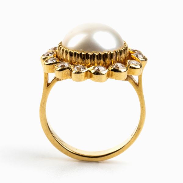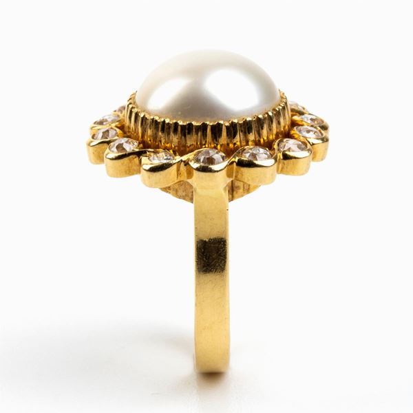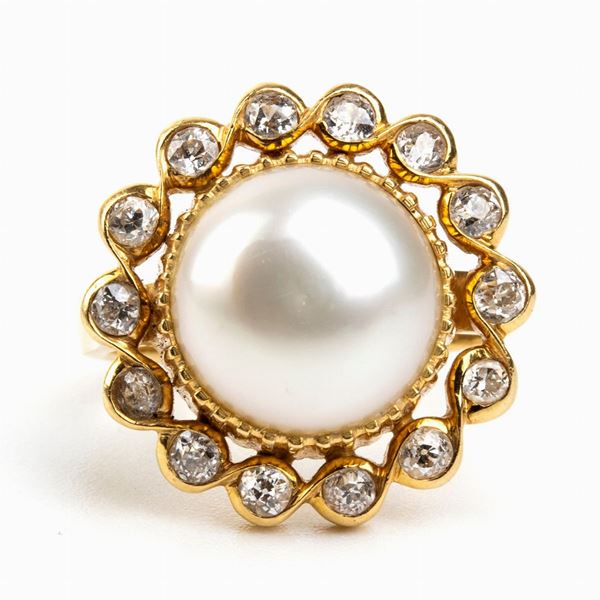 oro bianco 18k, motivo a fiore con perla mabe' contornata da diamanti. N. 14 diamanti di forma irregolare taglio old mine 1.70 ct circa. Punzonato "750".