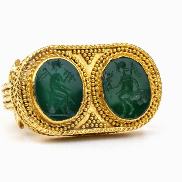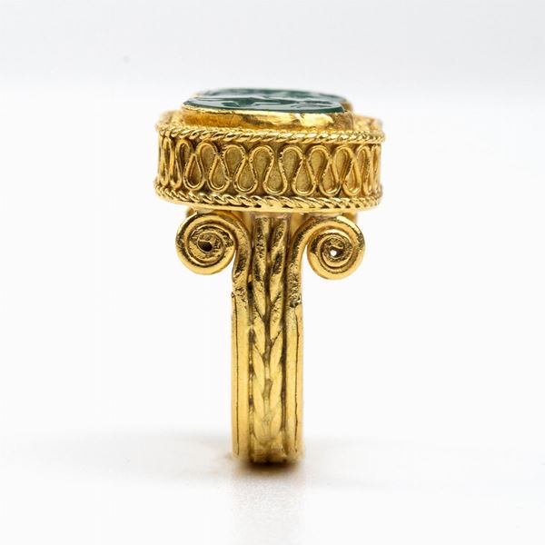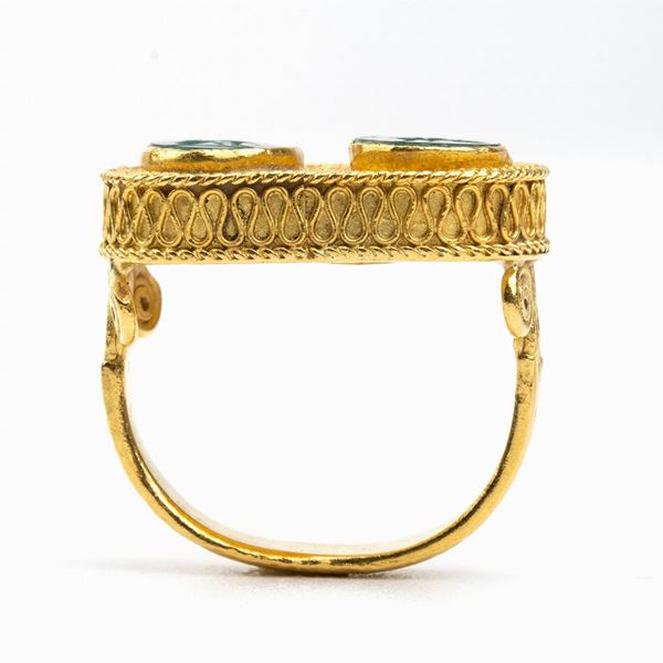 Anello in oro giallo in stile archeologico con paste vitree verdi