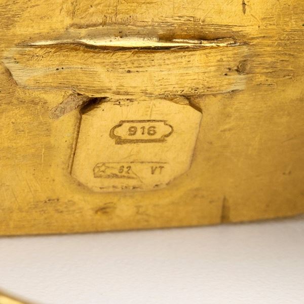 larga fascia in oro giallo 21k, incastonato con coppia di paste vitree verdi incise con motivi di ispirazione classica. Decori in motivi a cordonetto e micro granulazione. Punzonato "916 - 62 VT".