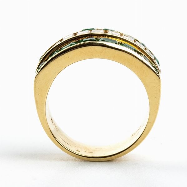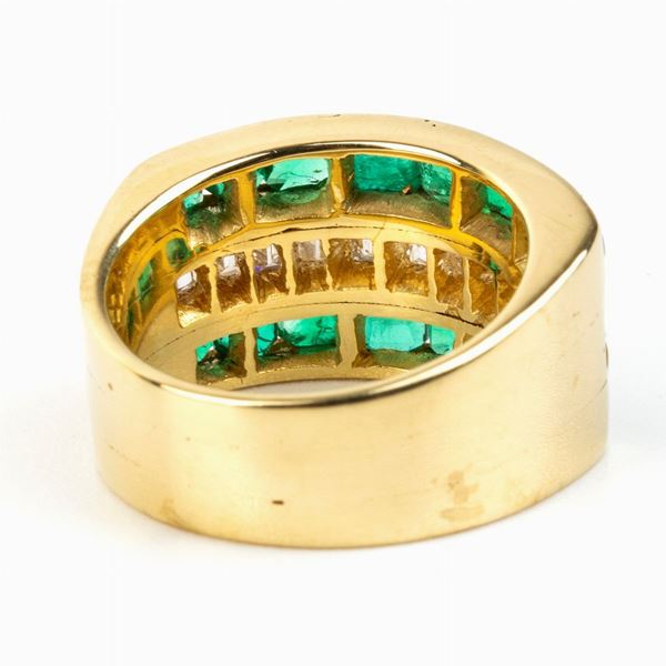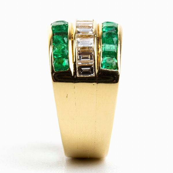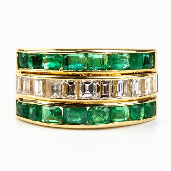 anello a fascia in oro giallo 18k, incastonato con una fila di diamanti tra due file di smeraldi. N. 11 diamanti di forma rettangolare taglio a gradini 1.10 ct circa, F-G, IF-VVS. N. 16 smeraldi di forma ottagonale taglio a gradini 1.80 ct. Punzonato "750".