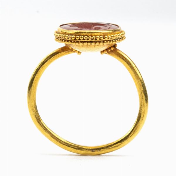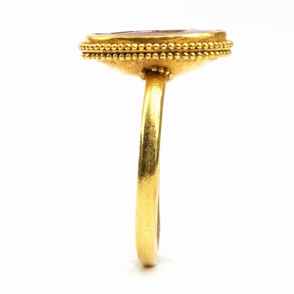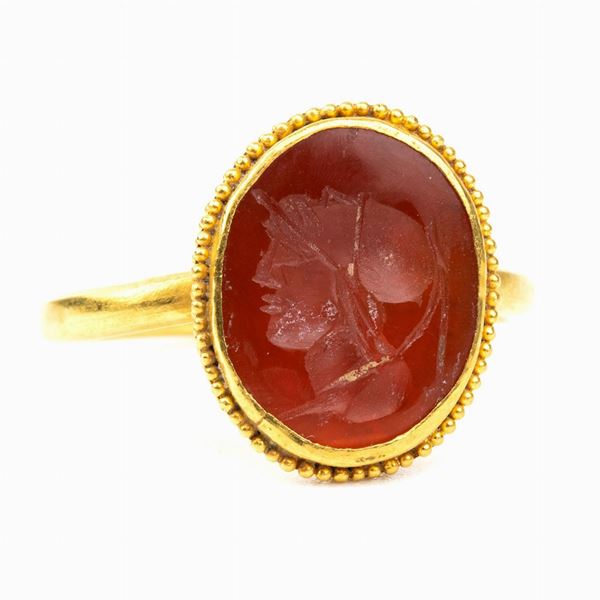 incastonato con corniola incisa raffigurante testa di guerriero con elmo. Decorazioni con la tecnica della micro granulazione.