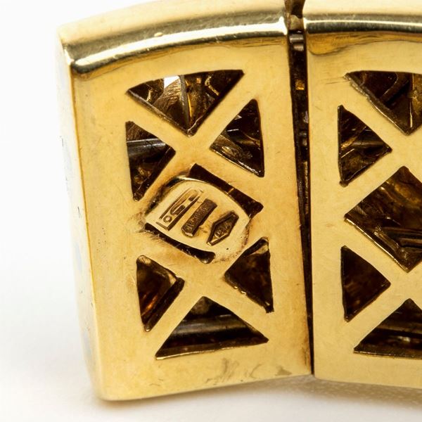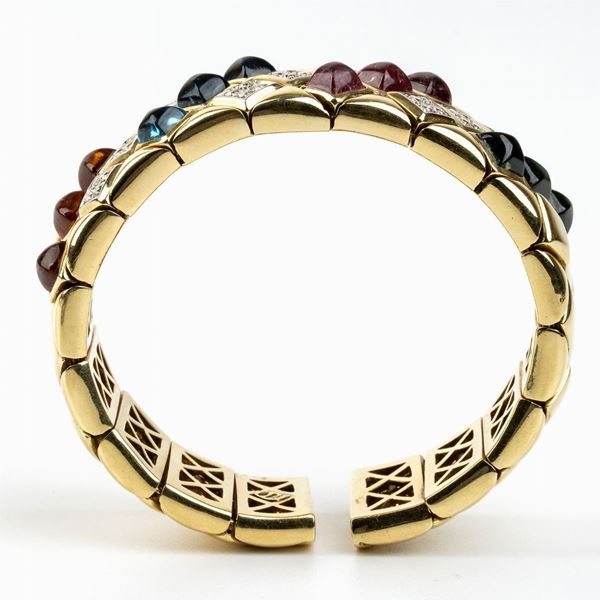 oro giallo ed oro bianco 18k, modellato come una fascia flessibile con motivo geometrico ad alveare, incastonato con piccoli pave' di diamanti e cabochon di gemme di colore (tormaline e quarzi citrini). N. 36 diamanti di forma rotonda, taglio brillante 0.40 ct circa, F-G, VVS-VS. Punzonato "750".