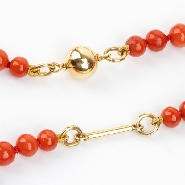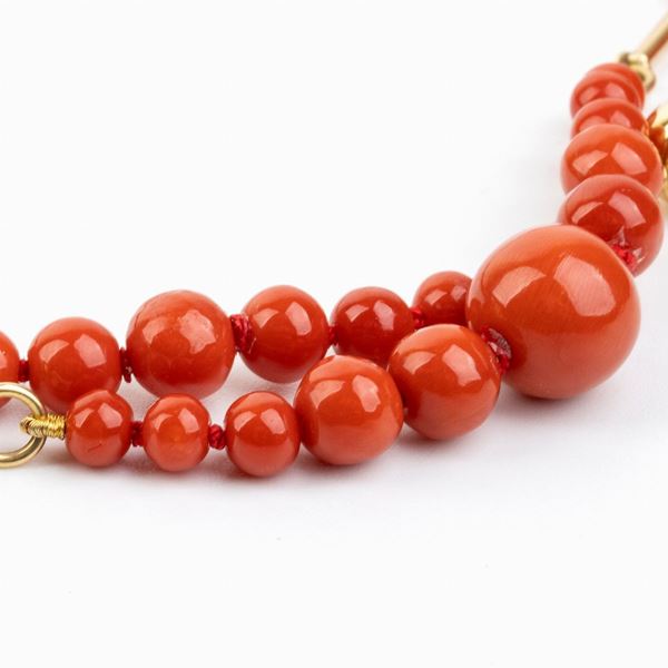 ad un filo di sfere di corallo Mediterraneo (corallium rubrum) disposte in gradazione, interrotte da elementi a barretta e sfere in argento dorato.