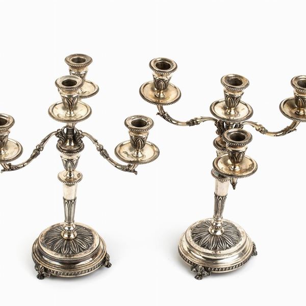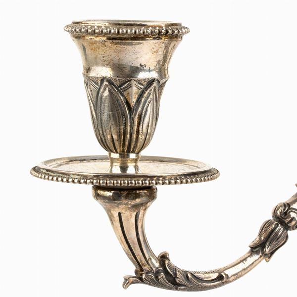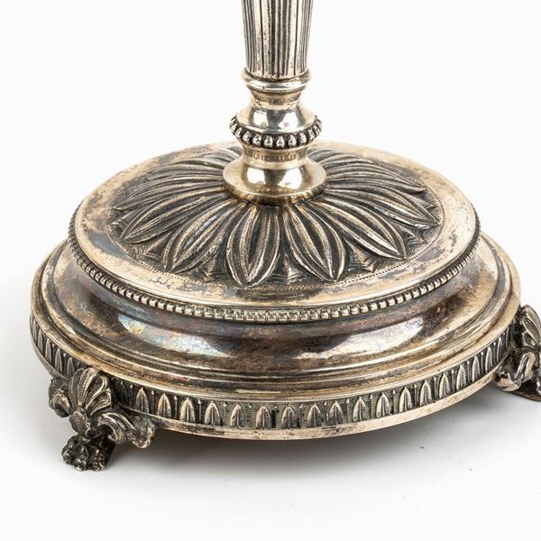 base di forma circolare decorata a palmette, parte superiore a quattro. Argento 800/1000, punzonati con marchi di epoca fascista in uso dal 1935 al 1945.