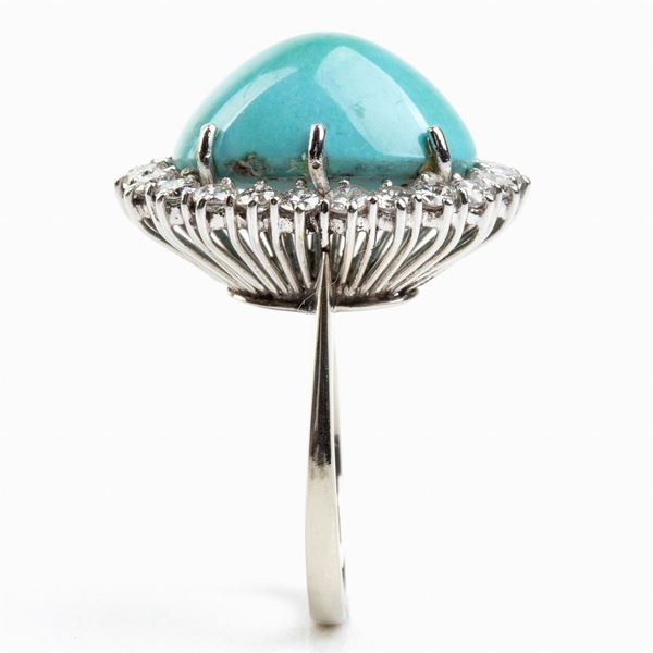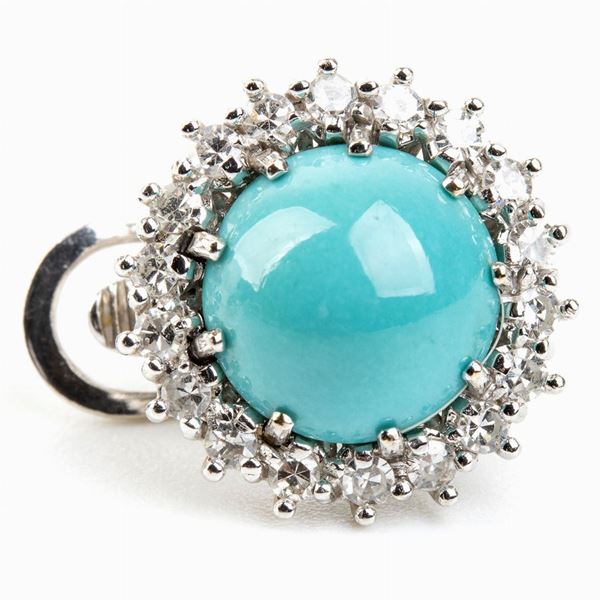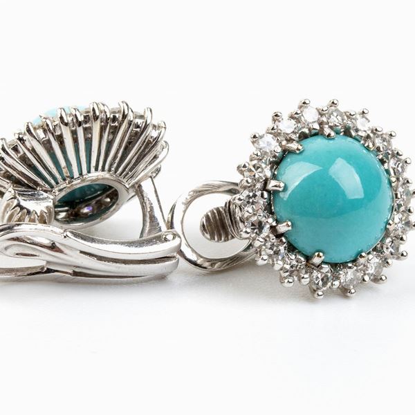 Incastonati con cabochon di turchese naturale incorniciate da diamanti. N. 23 diamanti di forma rotonda, taglio brillante + N. 360 diamanti di forma rotonda, taglio huit-huit, circa 2.20 ct totali, E-F, VVS-VS.