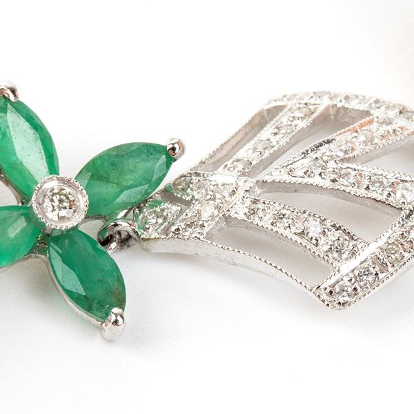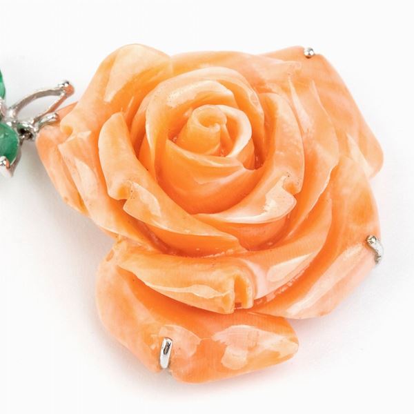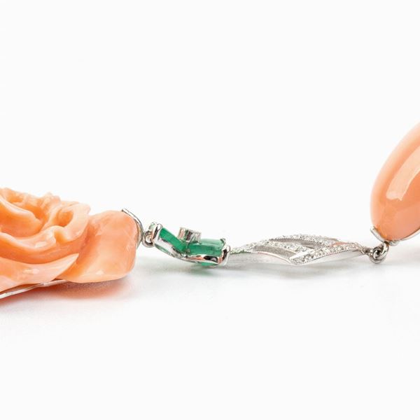 oro bianco 18k. Corallo cerasuolo (coralium elatius). Diamanti di forma rotonda, taglio brillante 0.55 ct circa.n Smeraldi di forma a navetta 1.20 ct circa. Punzonati "750".