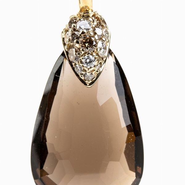 oro giallo 18k, con goccia di quarzo fume' sormontata da piccolo pave' di diamanti incolori e di colore fantasia marrone. Firmati "POMELLATO".