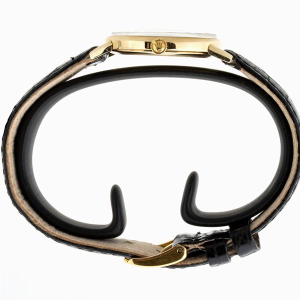 cassa in oro giallo 18k, quadrante argentato con indici a bastone firmato Rolex Geneve Cellini, sfere dorate. Movimento a carica manuale. Bracciale in pelle con fibbia dorata Rolex.