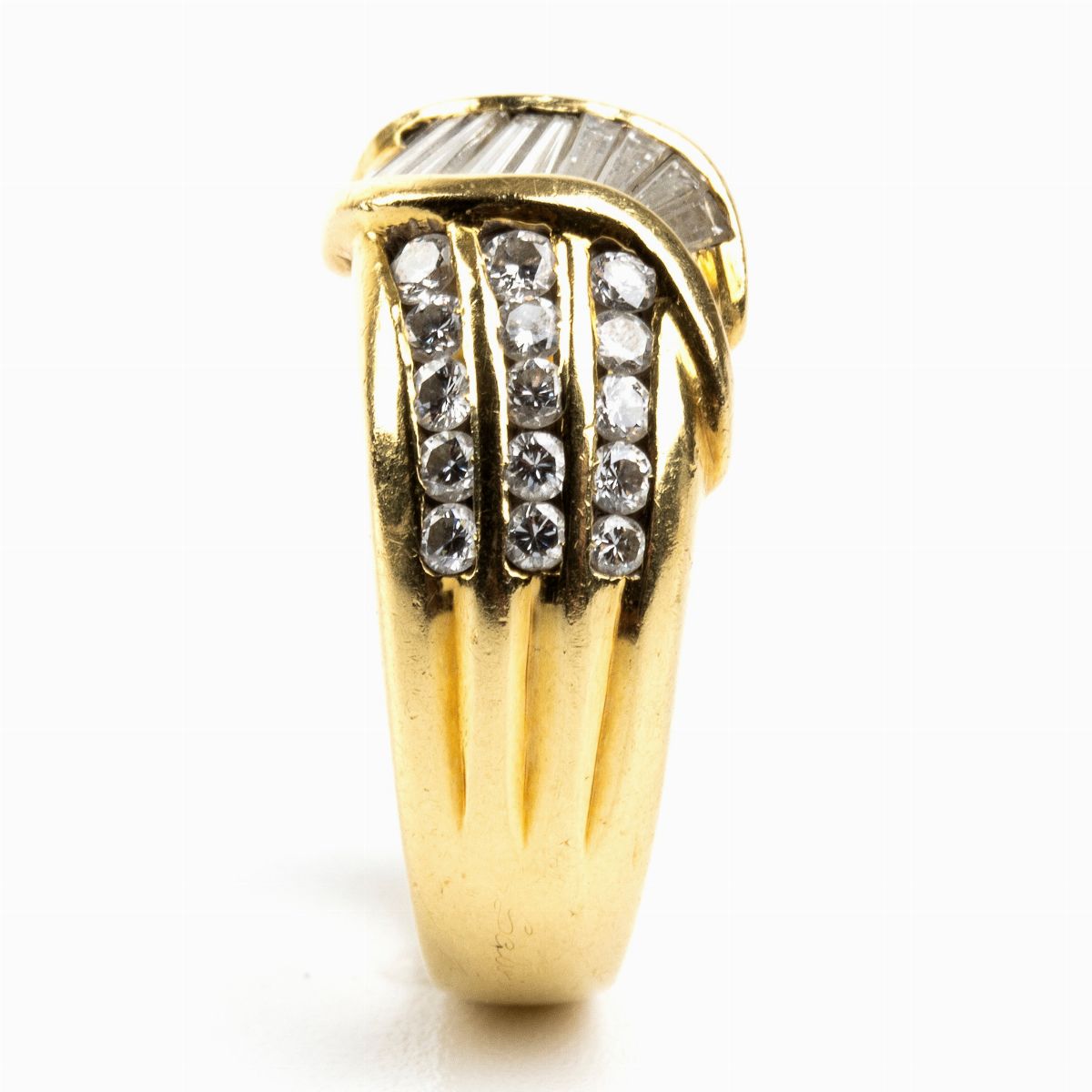 modellato come una fascia in oro giallo 18k, incastonato con file di diamanti taglio brillante e nastro in diamanti baguette. Firmato "SALVINI".