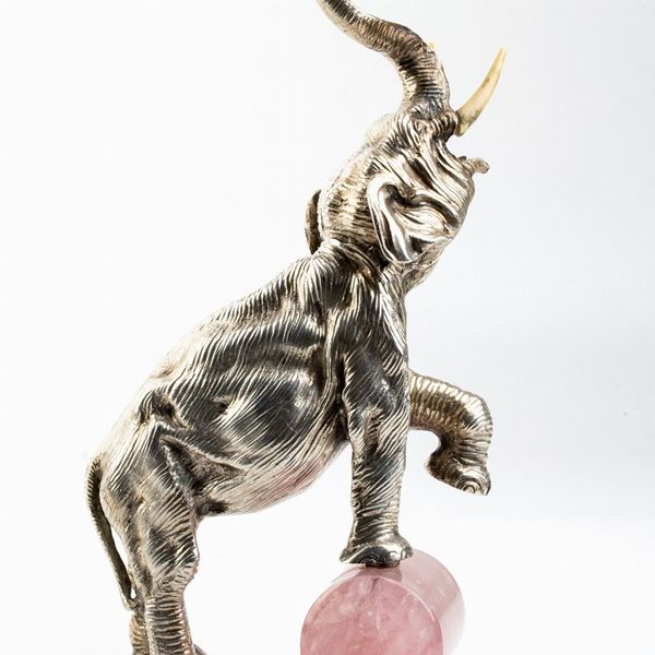 raffigurante un elefante con le zanne in osso con la zampa sinistra appoggiata ad un cilidro in quarzo rosa. Argento 800/1000. Punzonata "800 - 244 MI", argentiere Eredi Mazzetti di pandini o Gavirati Egidio s.a.s..