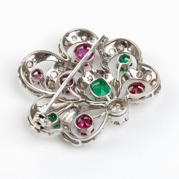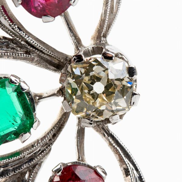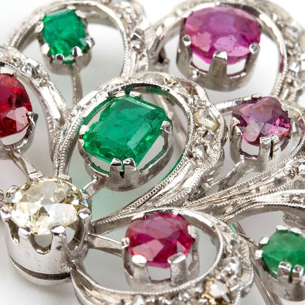 Spilla in oro con rubini, smeraldi e diamanti