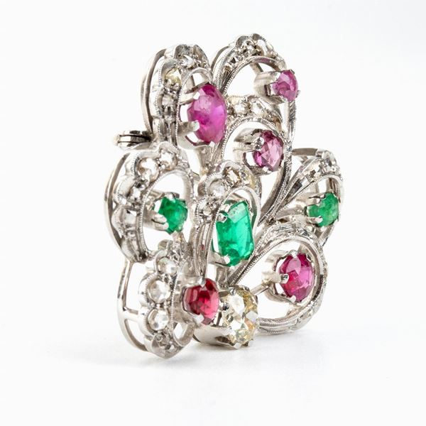 oro bianco 18k, con nastri in diamanti taglio a rosa e punteggiature in rubini e smeraldi. N. 01 diamante taglio old mine 0.60 ct circa, J-K, VS. N. 03 smeraldi forme e tagli vari 1.50 ct circa. N. 05 rubini di forme e tagli vari 3.40 ct circa. Punzonata "750".