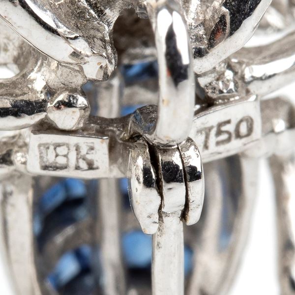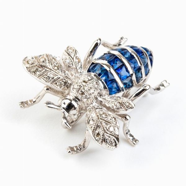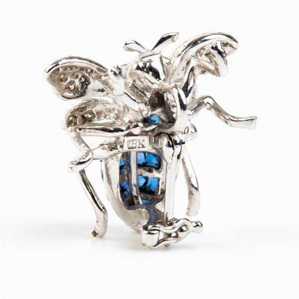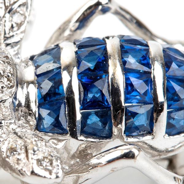 oro bianco 18k, ali incastonate con diamanti e corpo in zaffiri. Diamanti di forma rotonda, taglio brillante 0.15 ct circa, H-I, VS-SI. Zaffiri di forma quadrata, taglio francese 1.80 ct circa. Punzonata "18k".