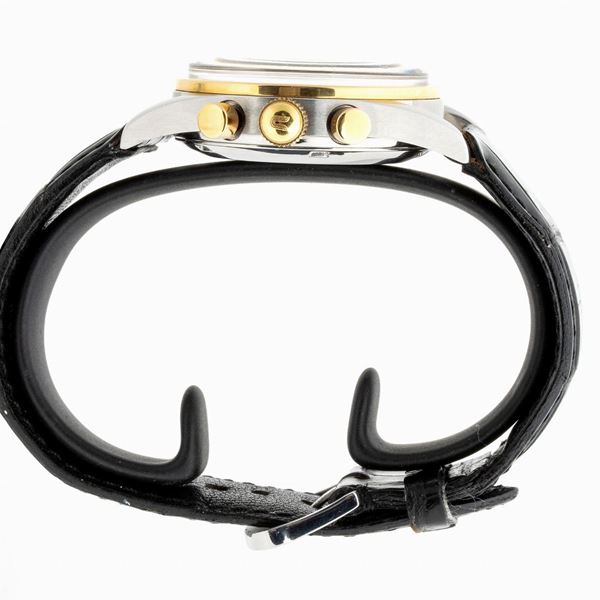 cassa in acciaio, lunetta in acciaio, quadrante argenté con indici a bastone applicati e tre quadranti sussidiari neri. Movimento a carica manuale. Cinturino in pelle, fibbia in acciaio.