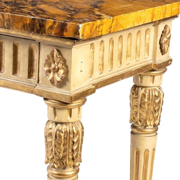 a bianco ed foglia d’oro, intagliata e scolpita su tutta la struttura a vista, il fronte ed i fianchi decorati con festoni a foglie di alloro. Le quattro gambe a forma troncoconica sono scanalate e adornate sia nella parte superiore che inferiore da foglie intagliate. Marmo non coevo.