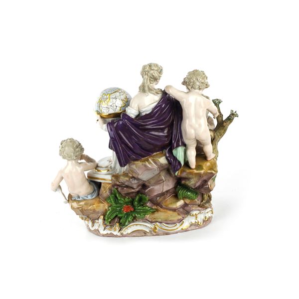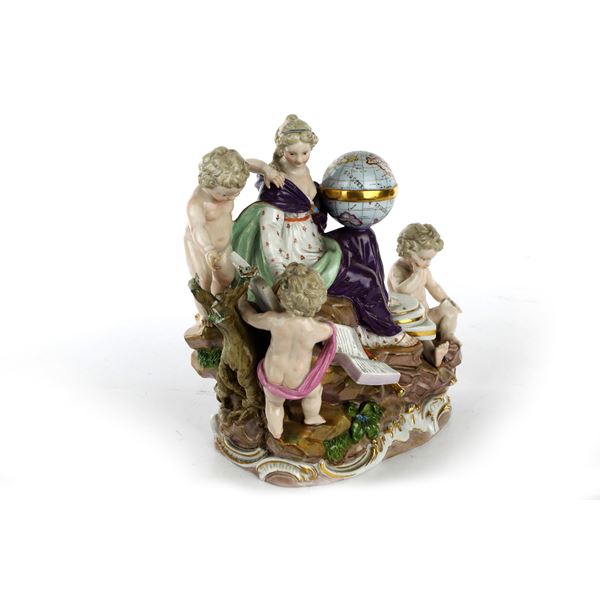 scultura in volume in porcellana policroma, base a rocailles, marca blu sottosmalto , manifattura sottosmalto di Meissen. Piccole mancanze