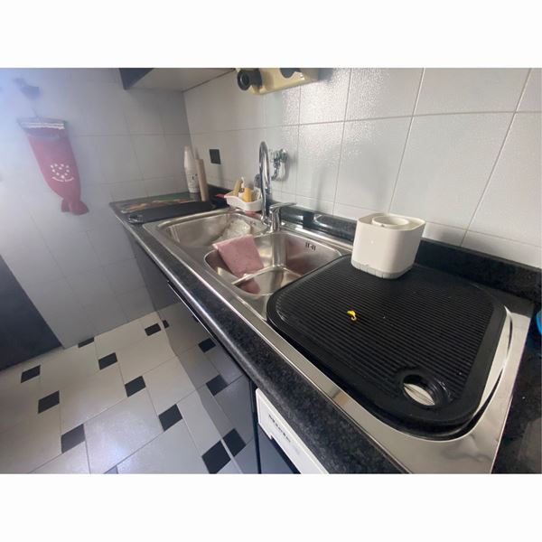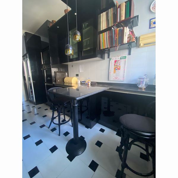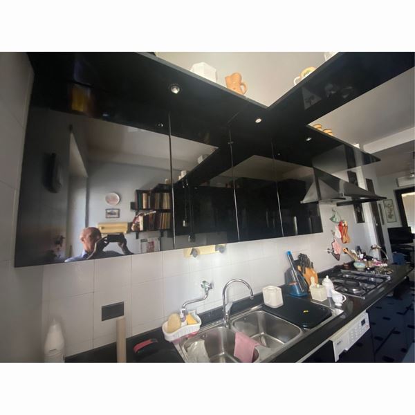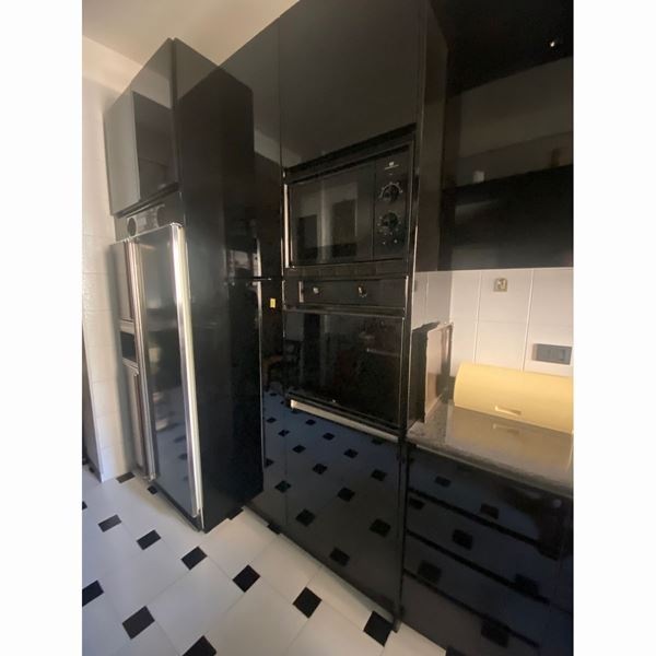 con fuochi ,lavello, elettrodomestici, lavatrice, lavastoviglie, frigorifero, forno elettrico, forno microonde e impianto stereo con penisola pariatale , tavolo da pranzo in vetro e cassapanca di contorno in legno laccato nero, completa di 2 mensole in perfetto stato manutentivo