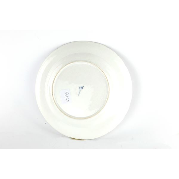 da coltello, tesa a rilievo a motivi floreali entro costoloni, base d'appoggio ad anello. Decoro con uccelli entro riserve dorate lungo la tesa e mazzo di fiori sul fondo del piatto, finiture in oro zecchino lungo il bordo. Marchio spade incrociate con punto tra le else in blu sottosmalto, manifattura di Meissen. Dorature in più punti usurate