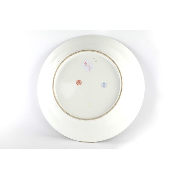 corta tesa su balsa e fondo leggermente concavo. Base ad anello ribassata, decoro a motivi geometrici ed animali fantastici, con tre riserve in oro su fondo nero con personaggi femminili in porpora. Manifattura reale di Sevres con data e marchi in blu e rosso sottosmalto al retro. Piccole usure alla doratura