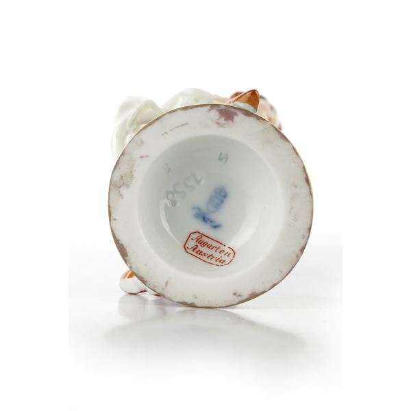 su disegno di Mathilde Jaksch. Manifattura Aurgarten Vienna, marchio in blu e rosso alla base sottosmalto, sigle numeriche dell'autore e decoratore incusse nella pasta.