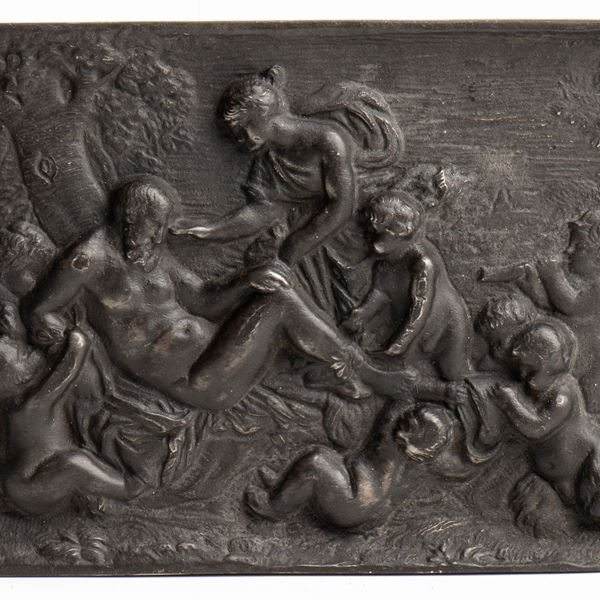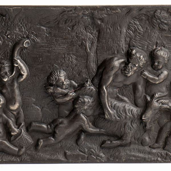 Satiro tiene una capra (Amaltea) a terra, aiutato da quattro putti i, altri due putti suonano con tamburello ed un corno. Sullo sfondo un bosco. Nel rovescio un punzone poco leggibile, sul bordo un giglio