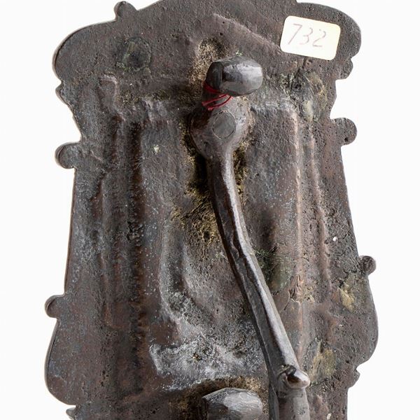 Pace in bronzo fuso, patina marrone; mm 133,4 x 80,4; gr 207,7.